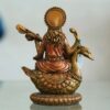 This image depicts Saraswati, the Hindu goddess of knowledge, music, arts, and wisdom. She is seated on a white swan, playing a veena, a stringed instrument. She is adorned with jewelry and draped in white and red.